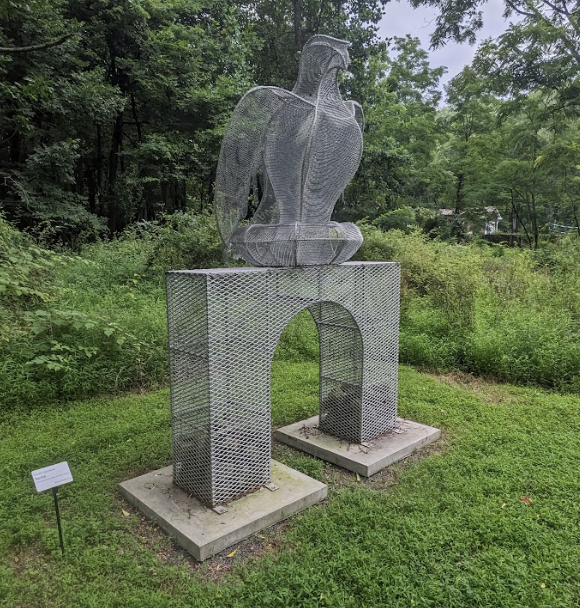 Winding just a bit further down the trail we pass an installation on the left called "Aerie" by Sarah Haviland, made of steel, wire mesh, rebar, and stone, all of which create bold contrasts to the greenery around.