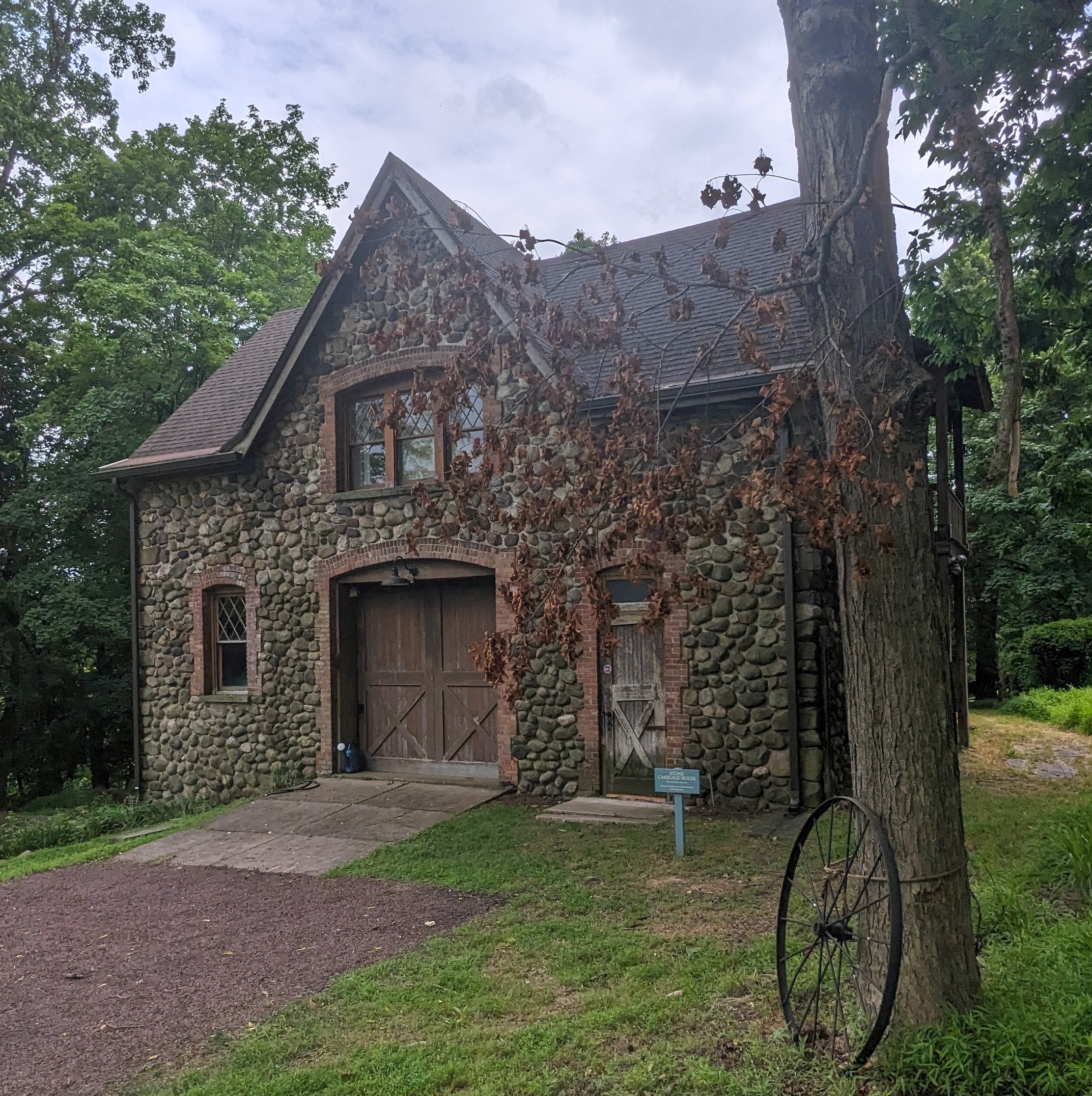 Continuing down the trail, we arrive at the elegant, one-of-a-kind stone stable or "carriage house". This structure, made entirely of fieldstones and Haverstraw brick, is a dramatic sight. It is believed to date back to the mid-19th century, potentially built during the ownership of Theodore Grunenthal, who maintained a thriving farm here during the Civil War era, though this is not for certain. Grunenthal was a farmer at the time (a grape grower!) and also may have built an original house here in a Stick style (a transition style between Gothic Revival and Queen Anne styles). On the other hand, in one line of thinking, Grunenthal's carriage house would likely have been simple. Therefore, a different hypothesis is that the house dates from the later Hilton or Dodge eras, two wealthy owners for whom a more glamorous carriage house makes sense. If you can, look for views inside the structure where the original horse stalls are still visible in the rear of the first floor, offering a direct view into the property's "horse-and-buggy days".