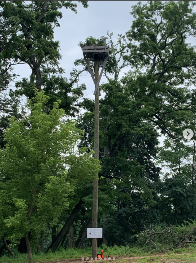 Continuing down the trail, notice the enormous pole off to the right, and look to its pinnacle. The pole hosts a bald eagle nesting spot at its summit. The nesting pole is a conservation-oriented installation by Ryan Clark (Senior Patrol Leader and Life Scout, Troop 2002), built as part of his Eagle Scout project. Clark raised funds for construction, and in his words, "we hope to encourage the growth of the local eagle population while fostering awareness and appreciation for environmental stewardship within the community".