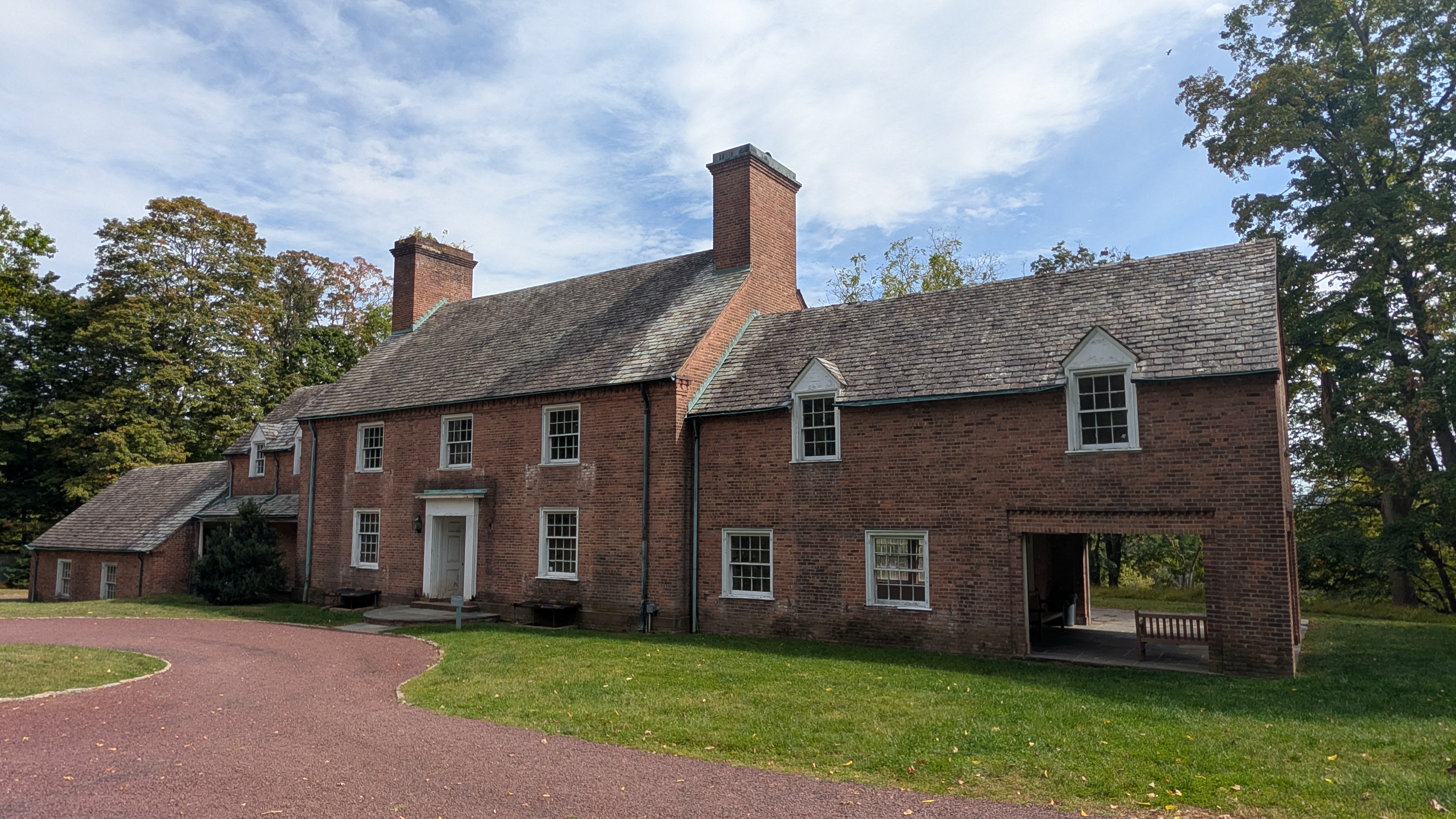 Continuing, we now stand before the primary residence, the Haring house. This approximately 4,000 square foot, narrow, two-story building is a Georgian Revival style (a subset of Colonial Revival style), brick, estate house built in 1934 for William Post Haring, Jr., by New York architect Julius Gregory. Among many other projects, Gregory designed the White Plains Community Church, in White Plains, NY. The Haring house features a multi-layered roofline and massive fireplaces flanking both ends of the slate roof.