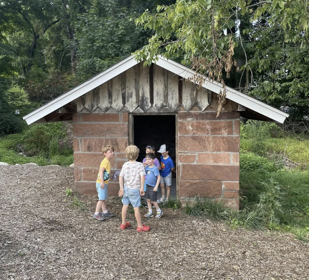 Interesting Observation: Look to the left of the carriage house to spot an antique haying tool still visible, connecting back to River Hook's nearly 300-year history as a farm. Also, looking uphill to the right, you will see a pile of local sandstone blocks, which are the remnants of a mid-19th Century building, now demolished, known as the "Owens Cottage".