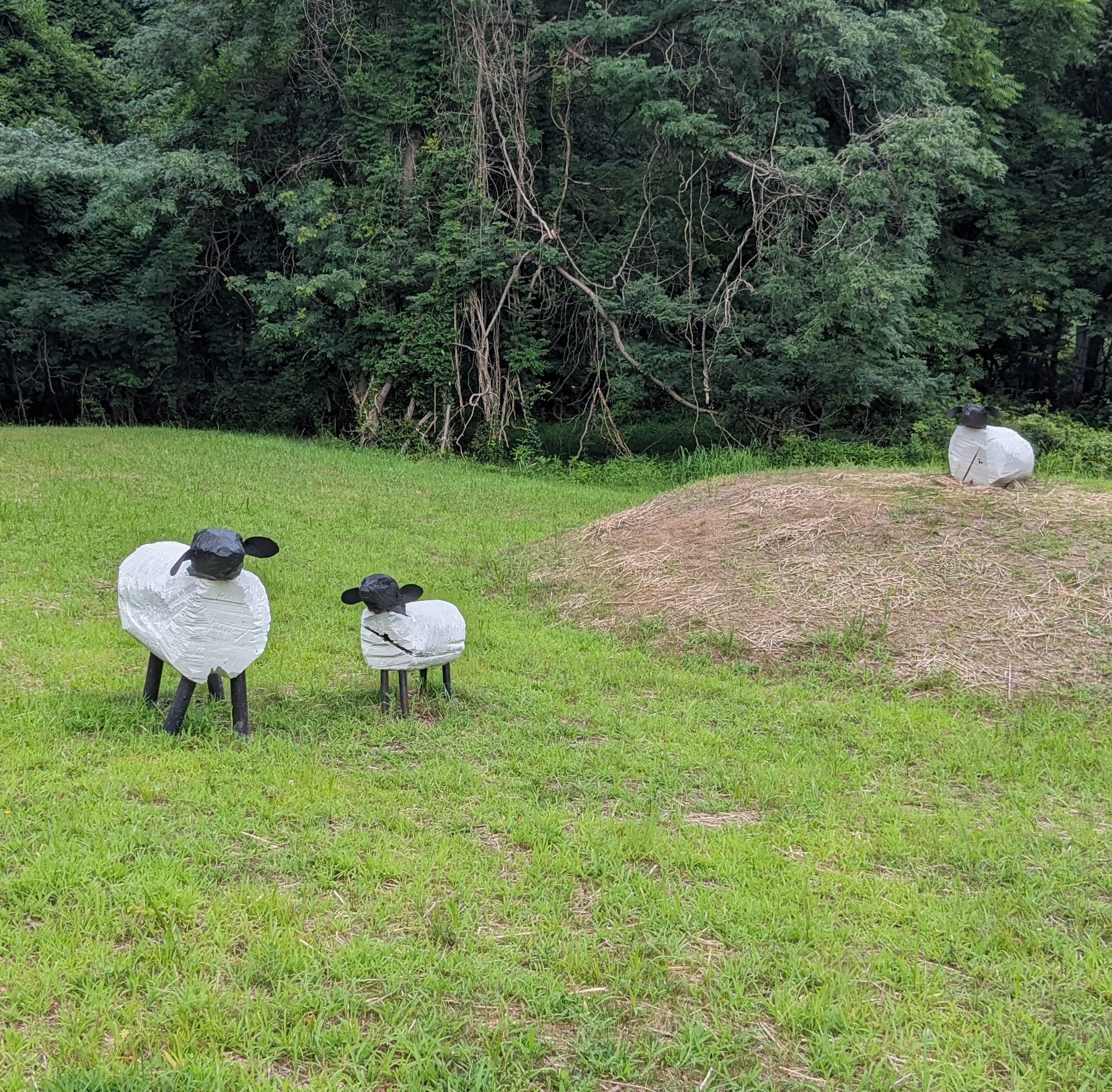 We begin our walk just through the North Midland Avenue entrance, off to your left (north), notice the Sheep of River Hook by sculptor Alberto Bursztyn. The installation is a playful nod to the property's history as a Sheep Farm. Each sculpted sheep has a whimsical form, crafted from locust wood sourced from the neighborhood. The set of them were unveiled during Arbor Day celebrations of 2025.
