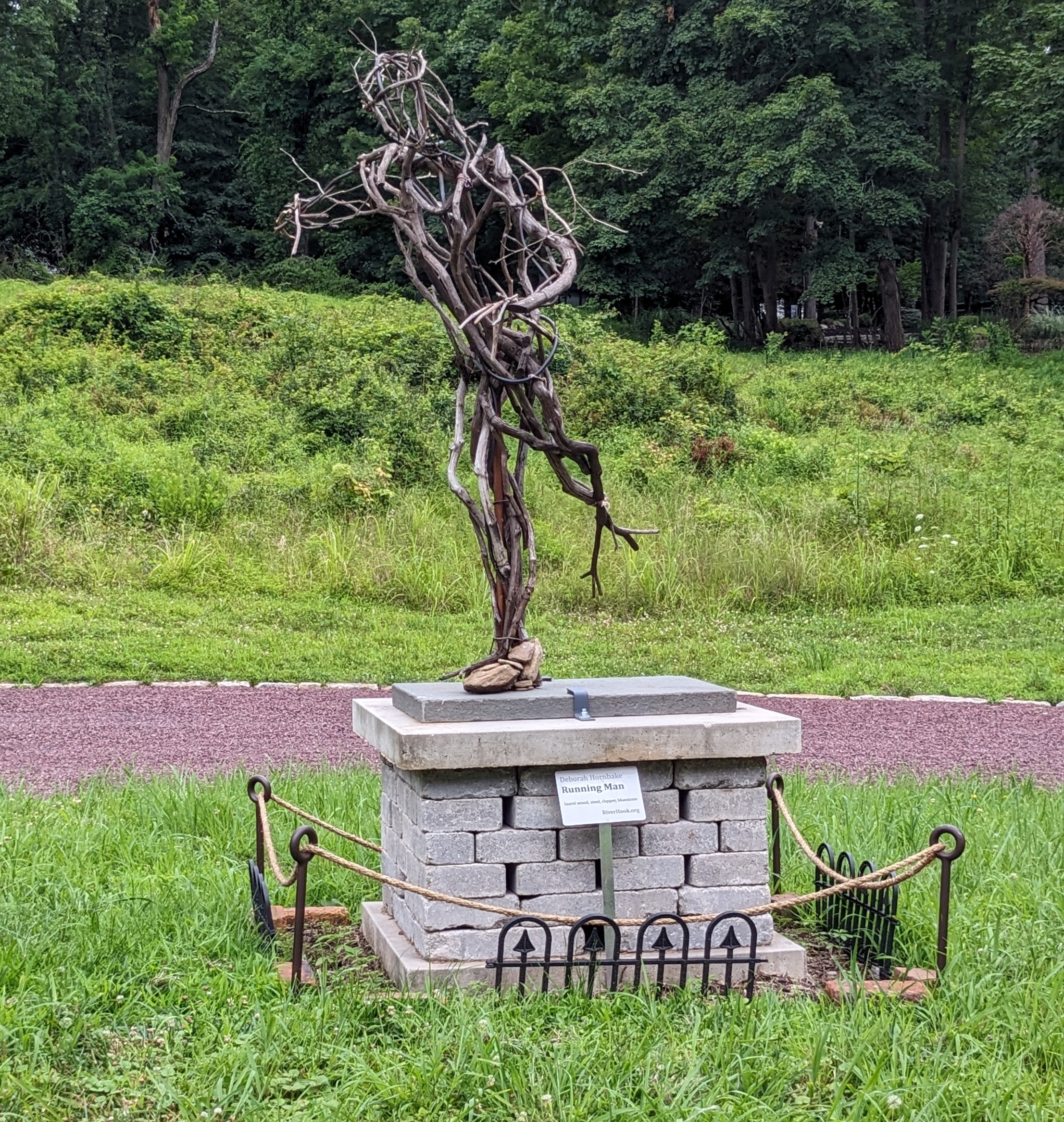 Stopping in the small circular driveway on the west ("uphill") side of the Haring house. Here, in the center of the drive, you can consider the vibrant "Running Man" sculpture, by D. Hornbake, crafted from laurel wood branches and presenting a dynamic, human-form figure in motion. This piece adds an expressive organic element to the River Hook sculpture path.