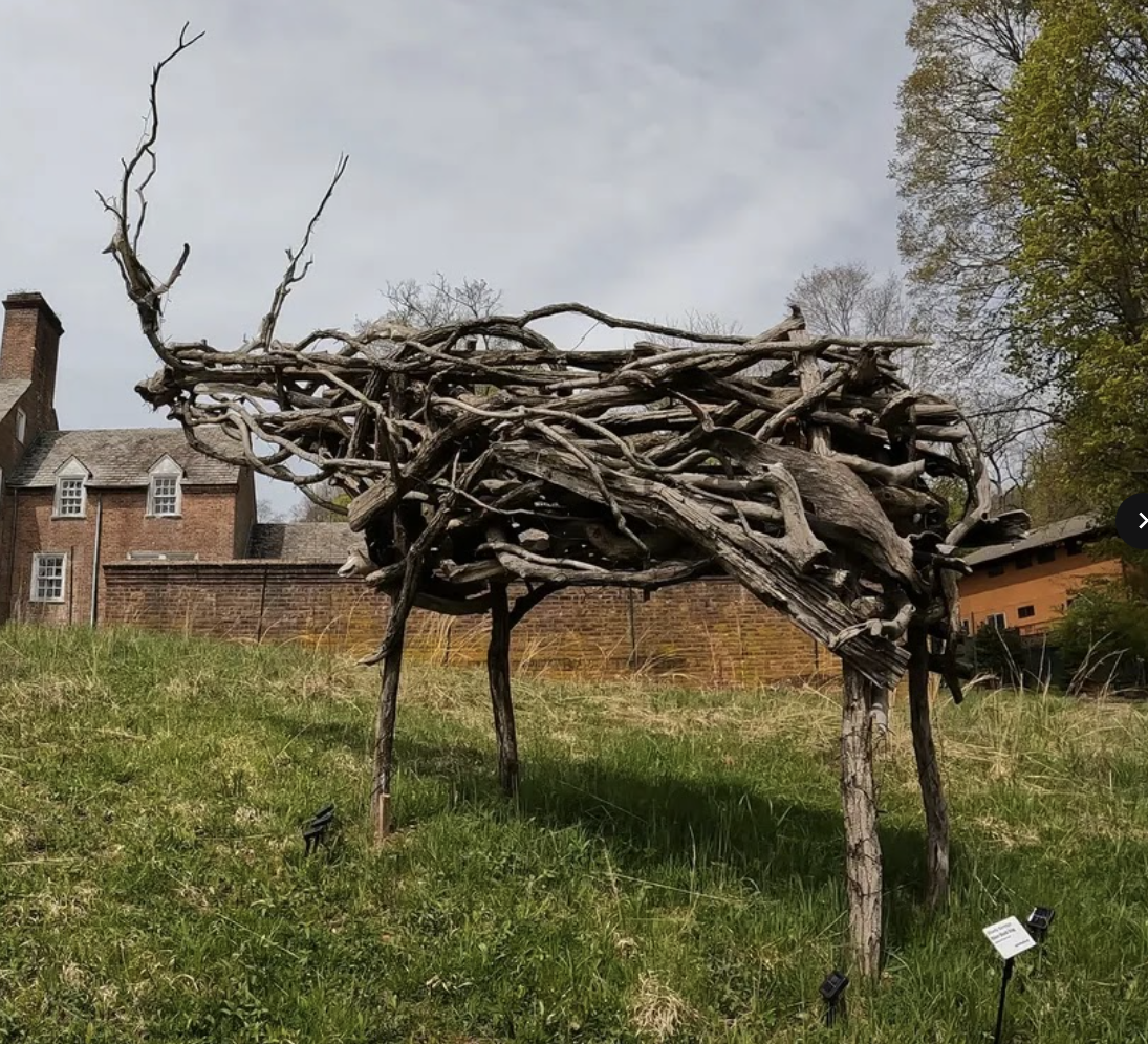 If you walk around to the other side of the Haring house from your present position, you will encounter the "River Hook Stag" sculpture, by Alberto Bursztyn. This dramatic stag sculpture - standing proudly in the meadows east of the Haring house - is made from reclaimed wood, some of it from the preserve. This work is quite representative of Bursztyn's style.